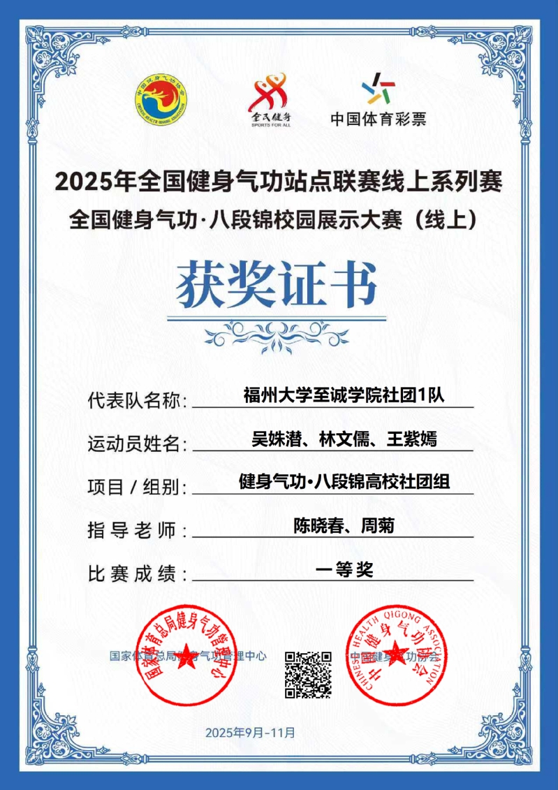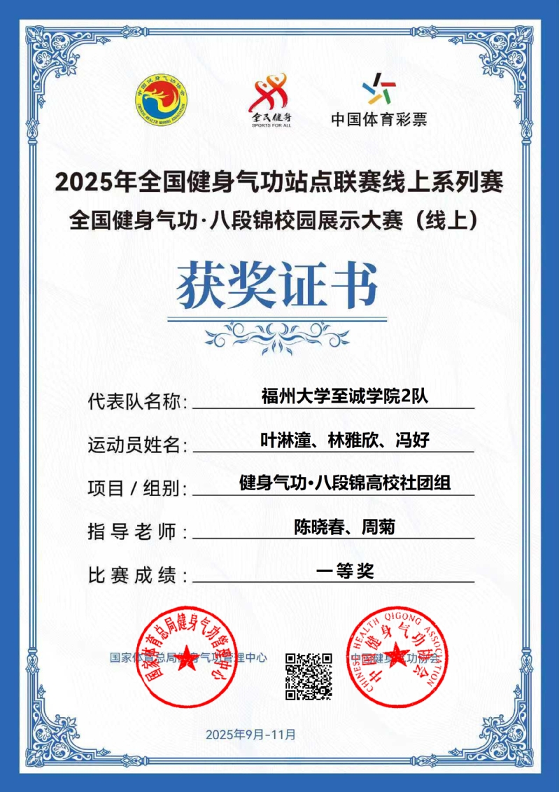 近日,由国家体育总局健身气功管理中心主办的2025年全国健身气功·八段锦校园展示大赛圆满落幕。我院学生健身气功队在陈晓春老师的悉心指导下,表现卓越,一举夺得2项全国一等奖。